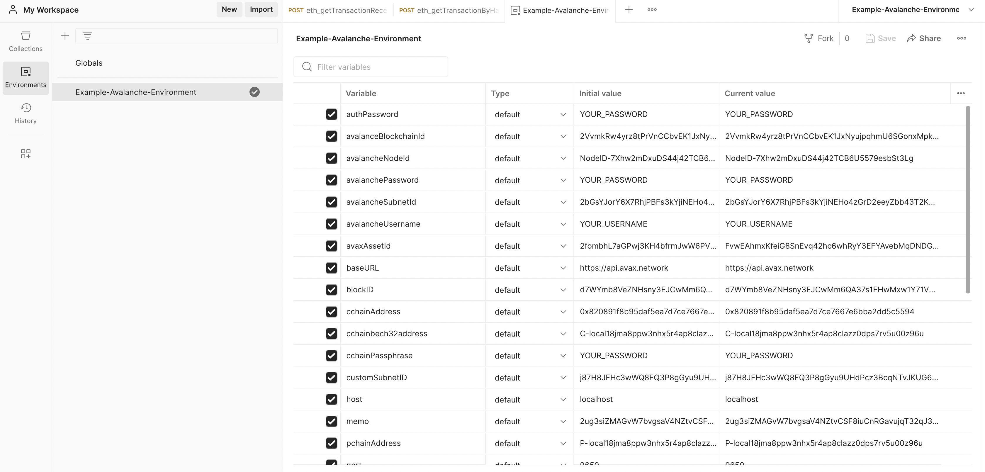 Only default variables are used in the Avalanche Environment file. To learn more about using the secret type of variables, please checkout the Postman documentation.